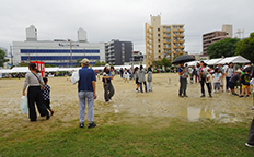 少し動いただけでも汗が滲みます。8:30に事務局に集合し、食材、イカ焼機、イカ焼用備品を整え、淀川区民まつり会場へ。